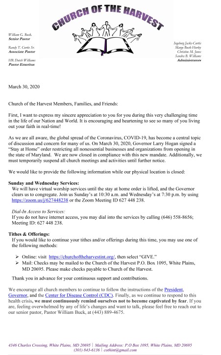 As we are all aware, the global spread of the Coronavirus, COVID-19, has become a central topic of discussion and concern for many of us. On March 30, 2020, Governor Larry Hogan signed a “Stay at Home” order restricting all nonessential businesses and organizations from opening in the state of Maryland. We are now closed in compliance with this new mandate. Additionally, we must temporarily suspend all church meetings and activities until further notice.