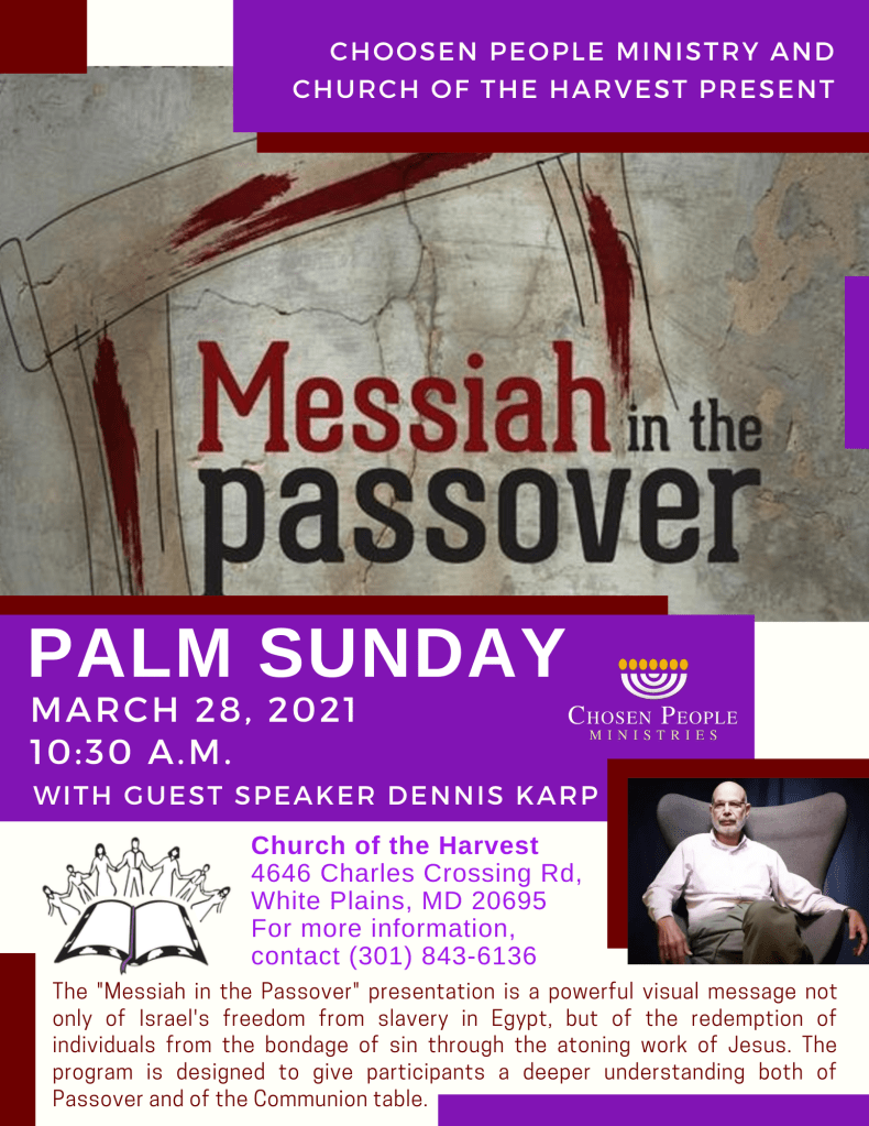 Reverend Dennis Karp of Chosen People Ministries in Chattanooga, TN will be speaking on “Messiah in the Passover,” Sunday, March 28th at Church of the Harvest, 4346 Charles Crossing Rd, White Plains, MD. The service will begin at 10:30 am and is open to all who are interested in attending.