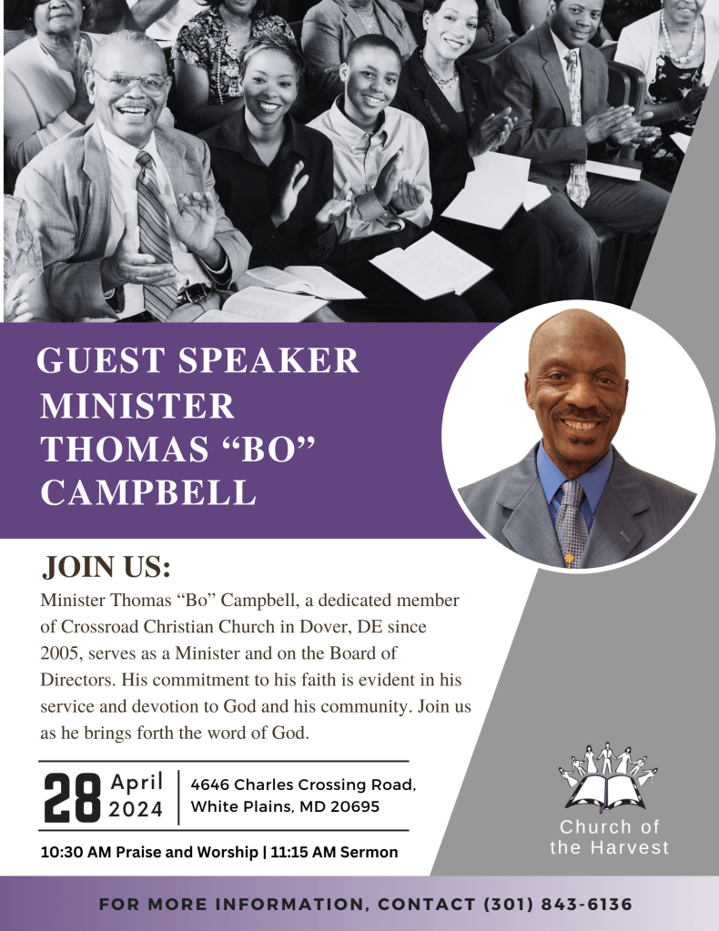 Join us as Minister Thomas “Bo” Campbell, a dedicated member of Crossroad Christian Church in Dover, DE, shares the word of God at Church of the Harvest on April 28th. Since 2005, he has served under the anointed leadership of Pastors Anthony & Margo Wallace, contributing his talents to the Music Ministry and the Soul Winning Action Team. Currently serving as a Minister and on the Board of Directors, Minister Bo’s journey with Christ began in 1981, shaping his life’s biography around loving the Lord and his neighbor. With 33 years of experience in the Federal Government and a career transition to HVAC engineering, Minister Bo’s faith infuses every aspect of his life, from his family life with his high school sweetheart Janice to his commitment to serving in the Kingdom of God. Don’t miss his inspiring message during following the 10:30 am Praise and Worship service.